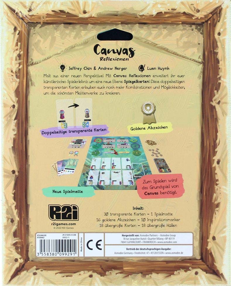 Mit Canvas – Reflexionen erweitert ihr euer künstlerisches Spielerlebnis um eine neue Ebene: Spiegelkarten. Diese doppelseitigen Karten erlauben mehr strategische Möglichkeiten, sodass ihr jetzt noch vielfältigere Kombinationen aus Element-Symbolen kreieren könnt. Durch die neue Spielmatte habt ihr außerdem eine größere Auswahl an Kunstkarten (selbst wenn euch die Inspirationsmarker ausgehen sollten) und könnt so besser vorausplanen.
