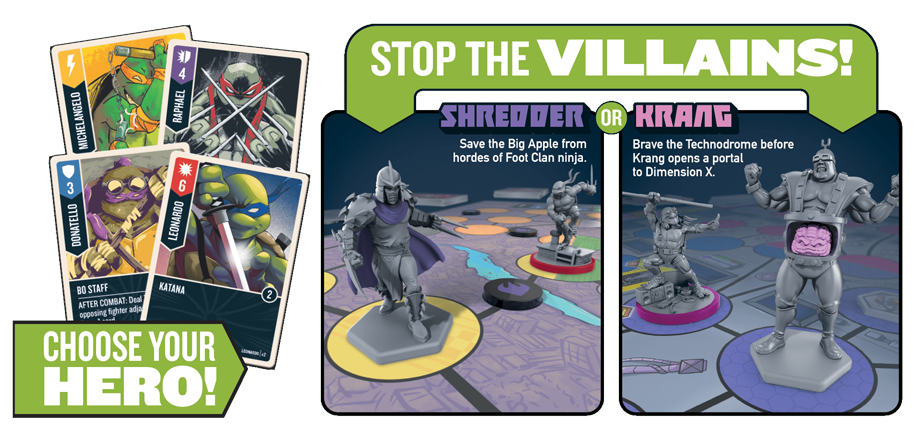 Unmatched Adventures takes the award-winning fighting system from standard Unmatched and adds a fun cooperative angle as 1 to 4 players work together to defeat one of two villains in the set. The Turtles face off against Shredder, as he sends waves of Footsoldiers across the Big Apple. Or dare to enter the Technodrome and match wits with Krang, who uses the unpredictable traps and gadgets from Dimension X. And keep an eye on the multitude of minions they can call on: Bebop and Rocksteady, Baxter Stockman, Leatherhead, and more!